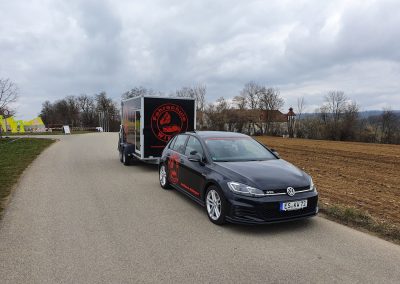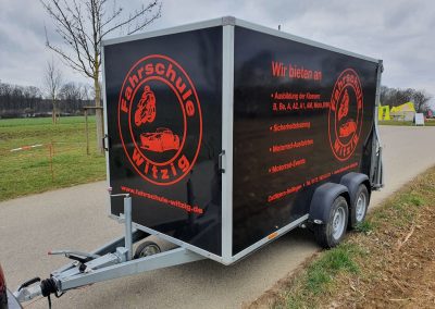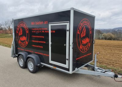geschlossener Kastenanhänger von Saris, speziell für den Fahrschulbetriebund den Transport von Motorrädern, besonders handlich für Übungen